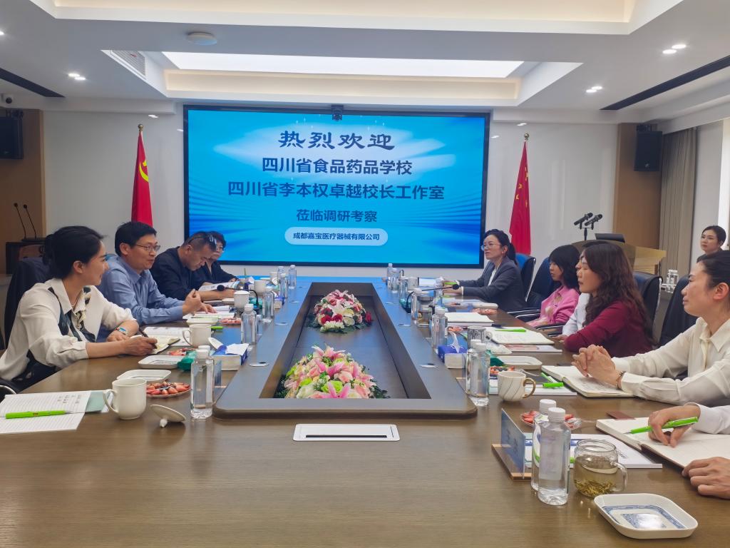 2026年4月9日,四川省食品药品学校党委委员、副校长李本权率卓越校长工作室成员一行,赴成都嘉宝医疗器械有限公司交流学习。公司董事长唐忠兵、总裁胡耀敏及高管团队热情接待。